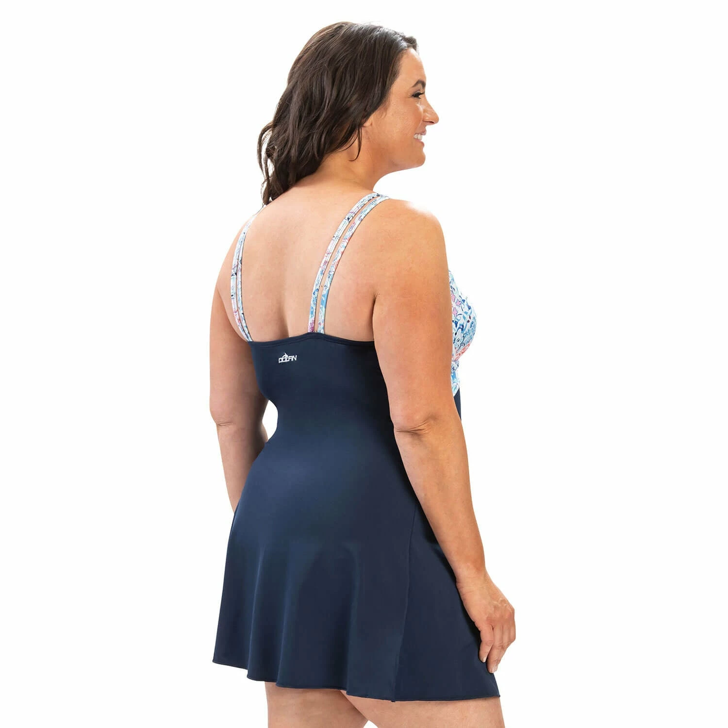 This swim dress is sure to help you feel your inner beauty and stay confident! With a knot front and a tiny keyhole, this Almafi print upper body and navy full-coverage bottom is an absolute must-have!