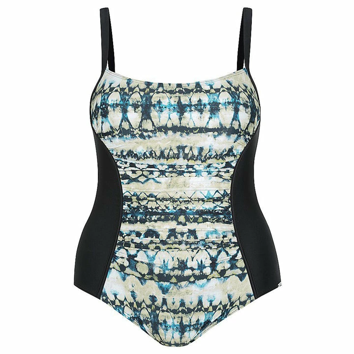 The Ink and Water Chlorine Resistant One Piece Swimsuit is fun twist on the traditional one piece bather. This womens bathing suit features a bold and geometric, ink inspired print, stylish ruching and contrasting solid black panels.