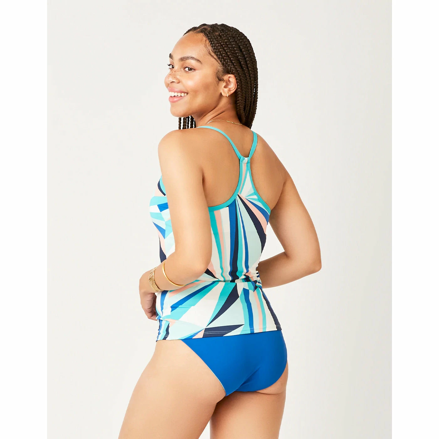 Based on our Stinson Bikini, the long torso of the tankini gives coverage where needed. The athletic t-back style is recommended for high levels of activity.