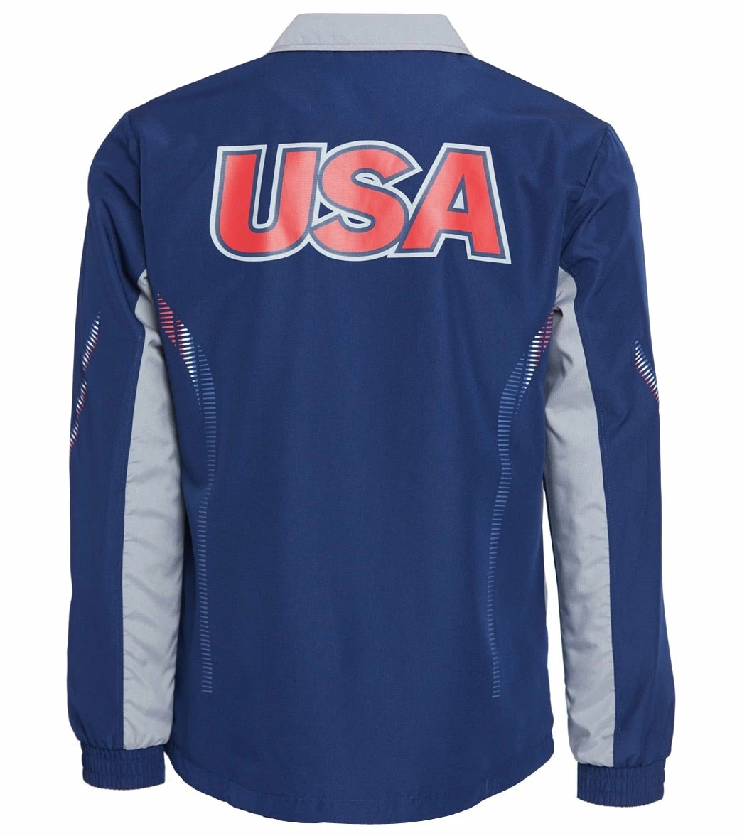 Stay suited up before your the meet in the Arena Men’s National Team Warm Up Jacket USA.