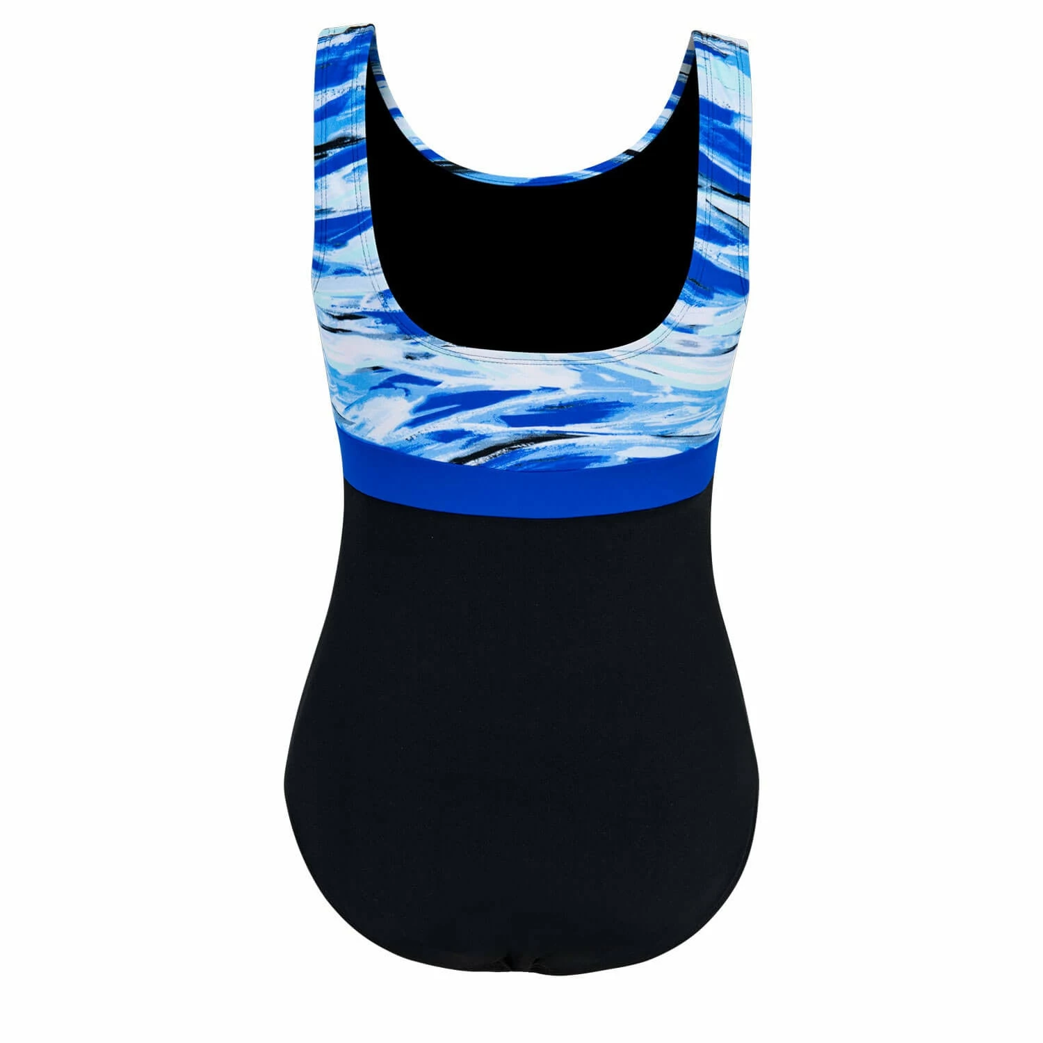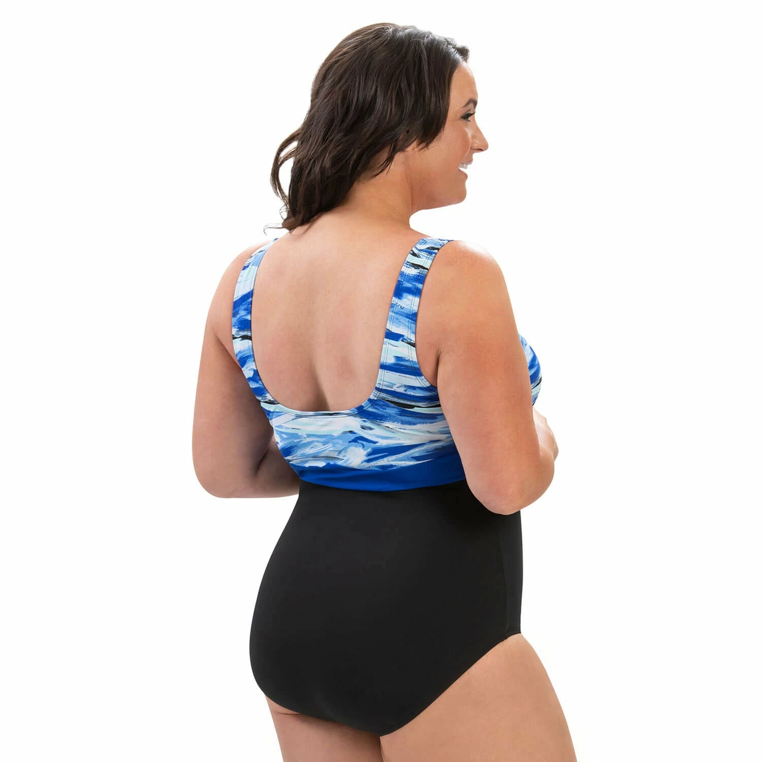 This Off The Grid color block moderate scoop back one piece solution swimwear swimsuit for women is PERFECT for your next day by the water. Complete with a brush stroke-like blue pattern and a black solid bottom featuring waistband and scoop back…need we say more?