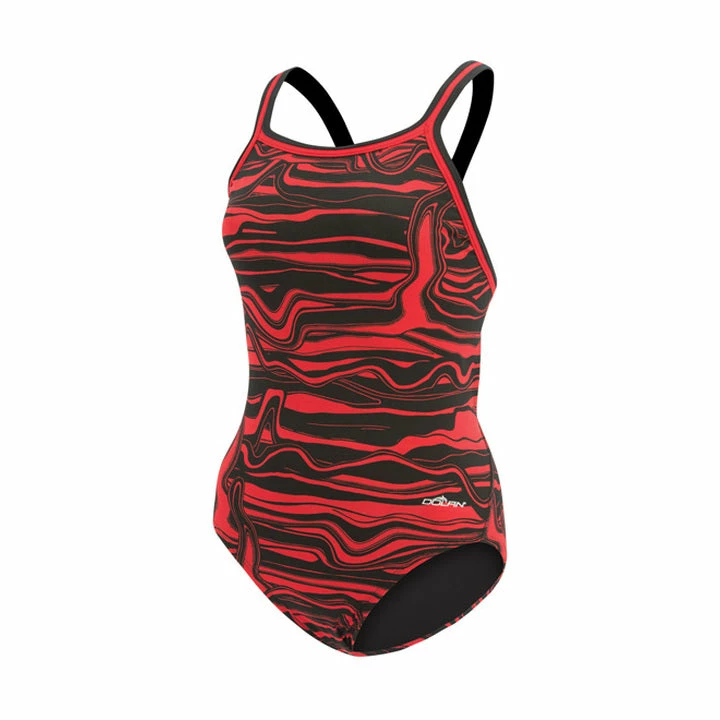 Train in style with the Dolfin Lava female one piece swimsuit. The Dolfin Lava Reliance DBX Back Female composed of completely polyester is the most durable new suit with guaranteed reliance chlorine resistance. The perfect practice suit has arrived!
