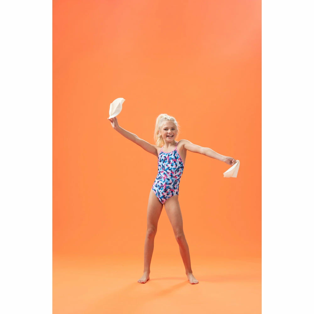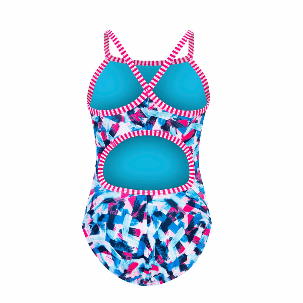 There is no doubt she will be asking to swim everyday knowing that this suit exists! This one piece swimsuit for little girls is in a pink, blue and white watercolor-like design all-over.