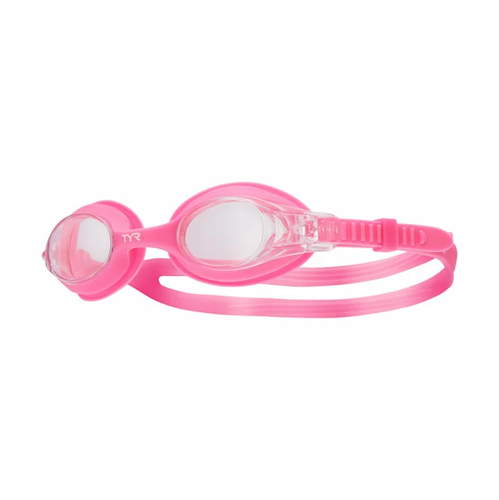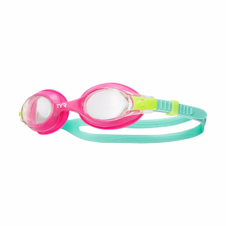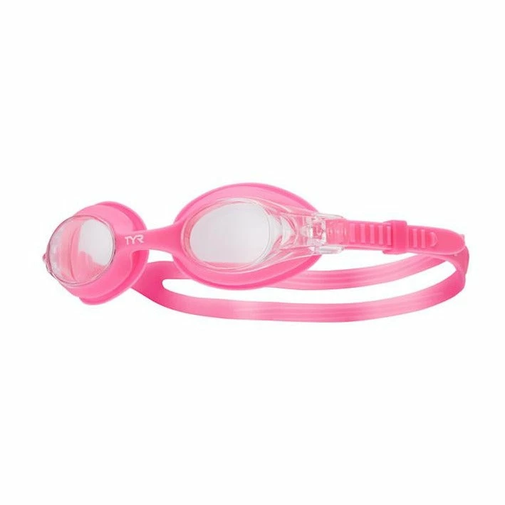 The TYR Swimple Goggle is the perfect swim goggle for smaller faces. With the TYR Swimple Goggle you will no longer have to spend time and energy fitting swim goggles on your kids! The TYR Swimple youth swim goggle is exactly what the name implies: SIMPLE! The headstrap on this youth goggle adjusts by merely pressing down on the release button, holding down and pulling the strap through until you find the perfect fit. The small uni-body frame is made specifically for children, requiring no adjustment around the eyes. Great colors and great fit make the TYR Swimple Goggle one of our most popular youth swim goggles!